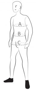For men's swimwear measure your hips (C). Wrap a tape measure around the widest point of the hips and bum. Choose the size closer to your hips measurement.